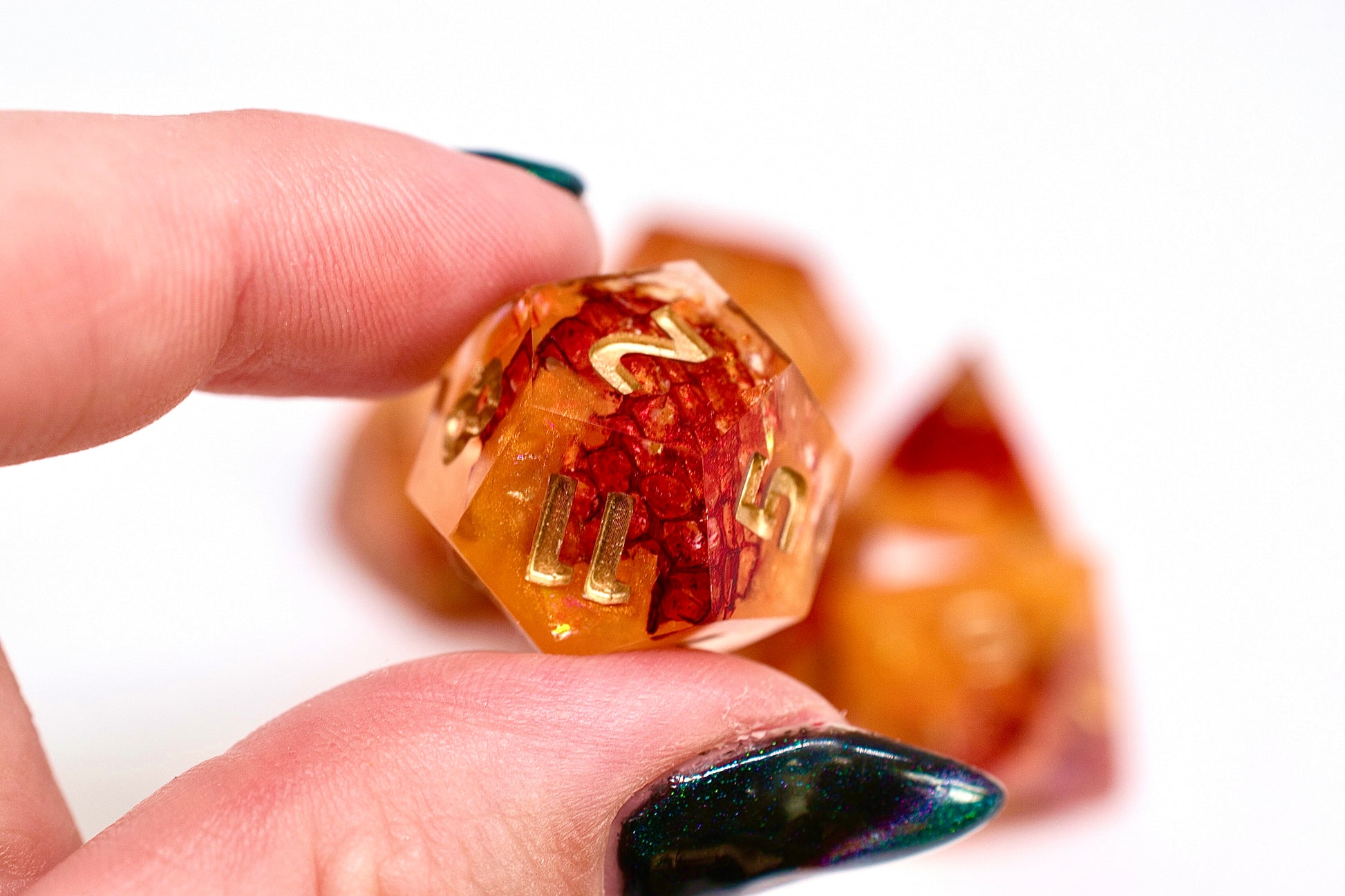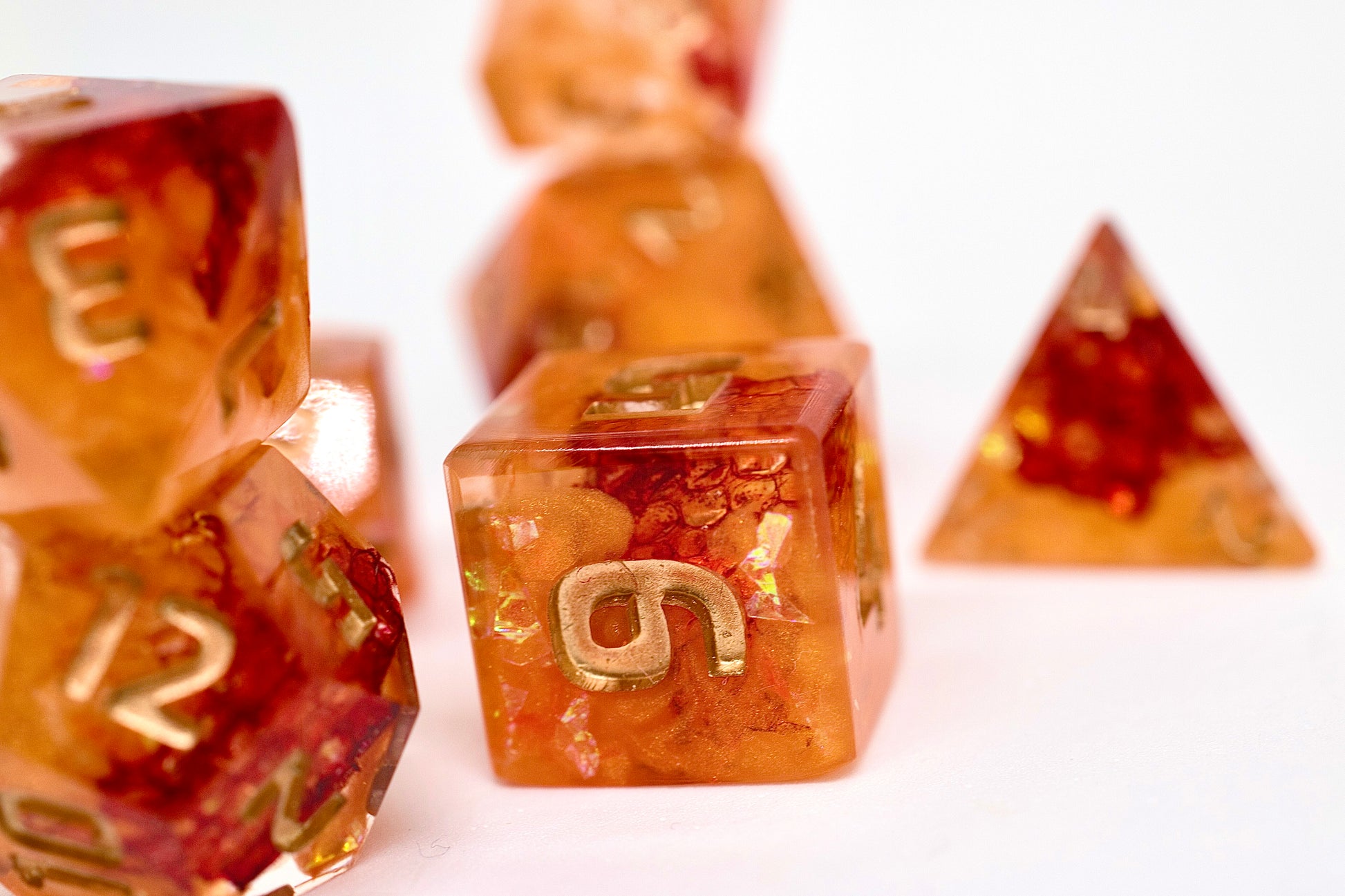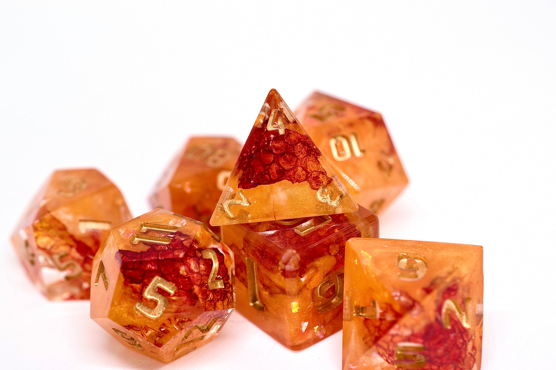 Crimson snake shed is engulfed in orange resin and glints of gold mylar that imbues this set with fiery passion.