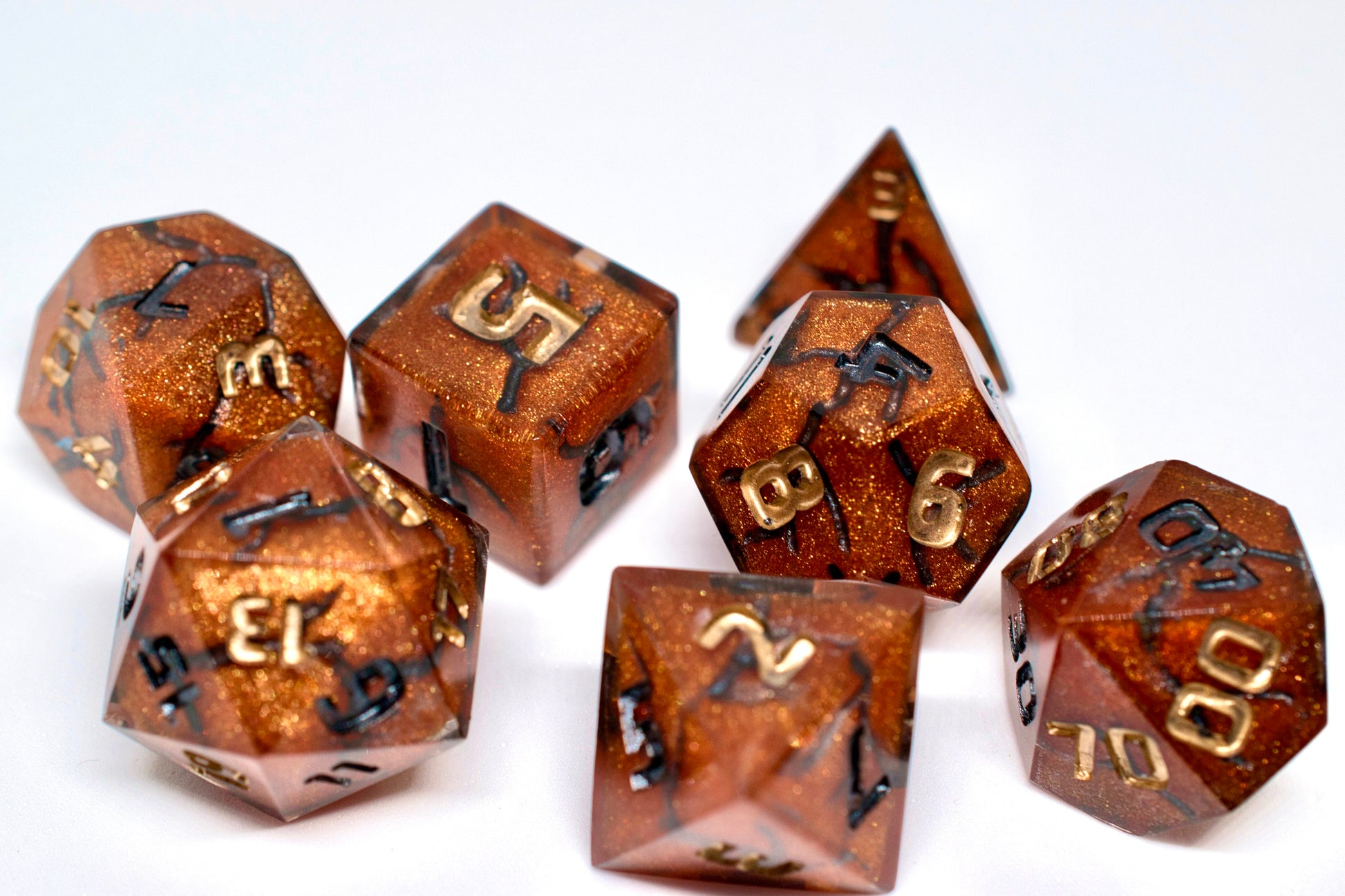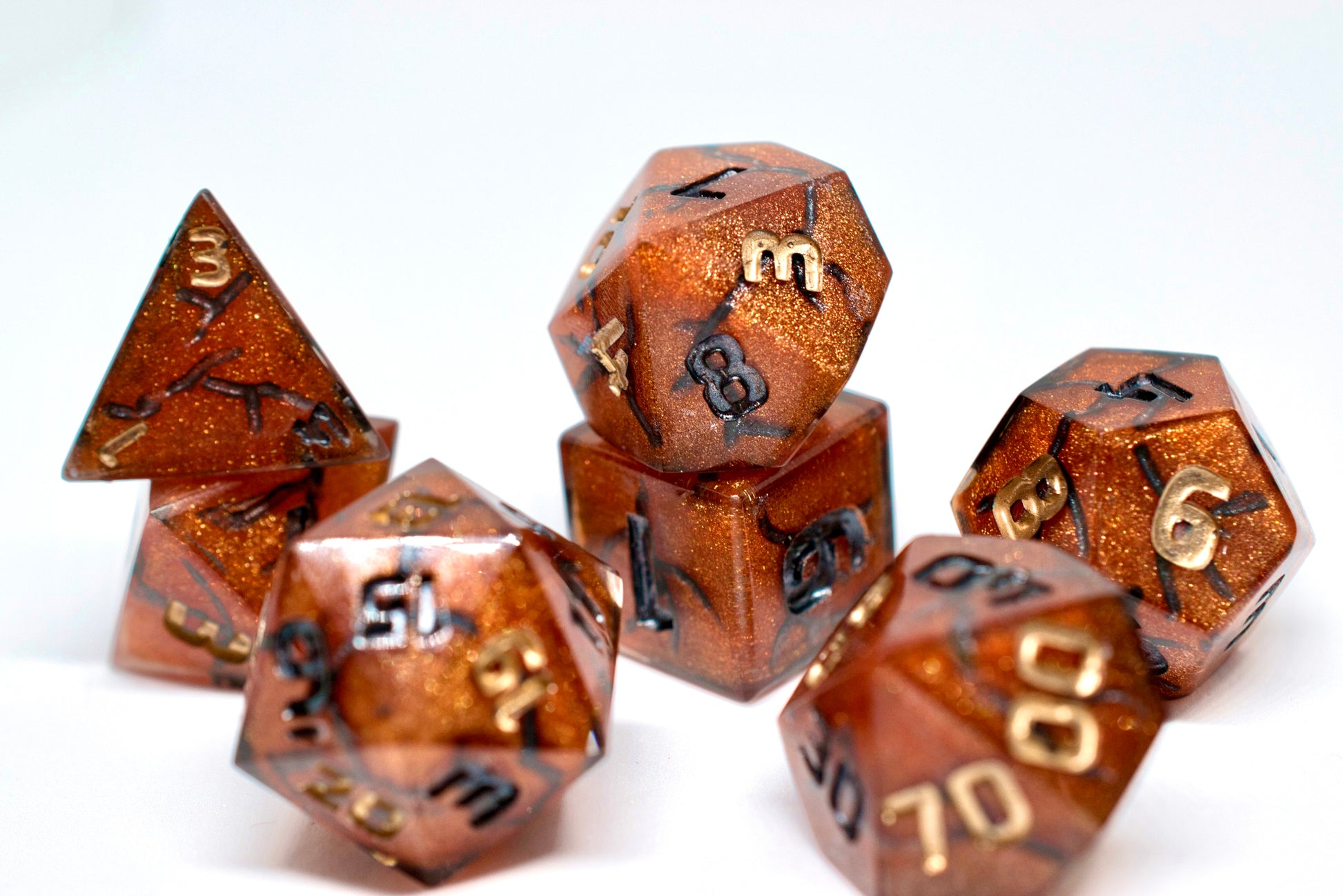 Bolts of black lightning pierce the shimmering orange of a sabbath night. These dice are finished with both black and gold ink to capture the essence of a witchy Halloween.